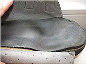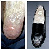 - Terapisko med individuelt fremstillede aflastninger ud- og indvendigt udleveres, hvis patientens eget fodtøj ikke er egnet. Vær opmærksom på at flere forhold, såsom ødem, forbinding eller aflastning, kræver ekstra plads i fodtøjet. For at aflaste effektivt vil man ofte komme ud for at skulle ”overkorrigere”! Aflastningen pålimes til sidst en dæksål, også kaldet ”sladresål”. Ved efterfølgende kontrol kan belastningsmønstret aflæses på ”sladresålen”, og herudfra foretages eventuelle korrektioner.