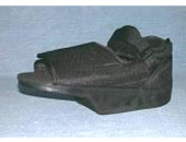 Anthrazit sandal med aflastning til et sår svarende til caput af 5. metatarsalknogle. Ovenpå limes en stødabsorberende sål og en udskiftelig ”sladresål”, der ved næste kontrol vil vise det funktionelle aftryk. |