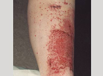 1. Rød irriteret, måske væskende hud, forårsaget af for meget sårsekret
