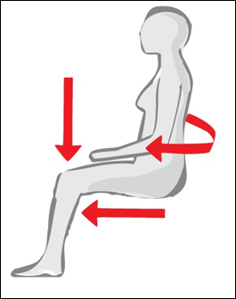Ill. 4.Bækkenet tilter bagud ved manglende mulighed for  stabilitet i kørestolen og siddesår på basis af  forskydningskræfter vil opstå.